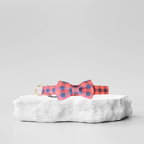 Red tartan material paired with a brown leather underside. This collar has a black buckle and a light, gold D ring for tag and leash attachment.
