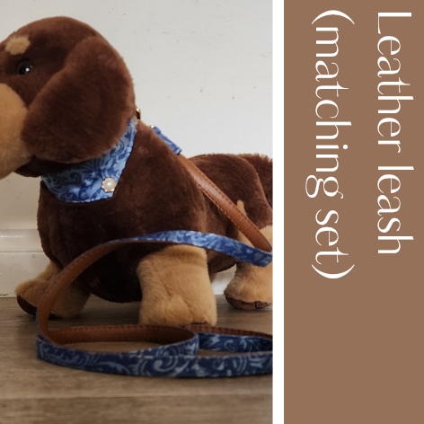 A blue bohemian material paired with a brown leather underside. This leash measures 122cms long. Also has matching bandana collar and bow tie collar available.